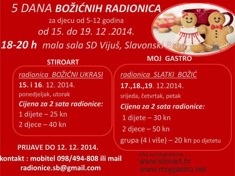 5 dana Božićnih krativnih radionica od kojih 15. i 16.12. 2014. Kreativna udruga Stiroart ima radionicu za djecu od 5-12.godina. Radionica će se održati puna 2 sata u prostorima Sportske dvorane Vijuš, mala dvorana u Slavonskom Brodu od 18-20 sati.